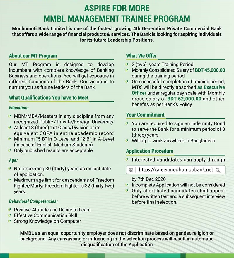 Job Circular Management Trainee Officer Recruitment At Modhumoti Bank Ltd - We are collect new modhumoti bank ltd job circular 2021 vacancies of their website.